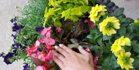 Beim Blumengießen vor dem Produktionsgebäude ist uns aufgefallen, dass mitten in der Amphore eine Bachstelze ihre Eier ausbrütet. Offenbar hat sie sich durch die zahlreichen Leute, die hier ein- und ausgehen, bisher nicht stören lassen.