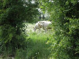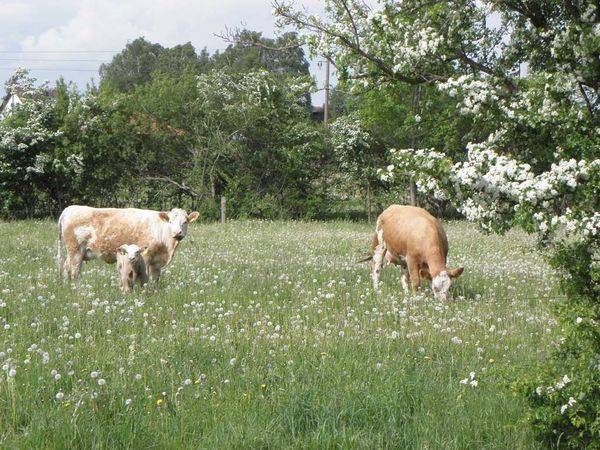 Gleich hinter unserem neuen Produktionsgebäude weiden die Kühe auf unserer Wiese. Welch ein idyllischer Anblick. Man hat hier den Eindruck, daß sich Mensch und Natur im Einklang befinden.,... und in der Wiese neben den Kühen geht der Storch auf Beutefang!