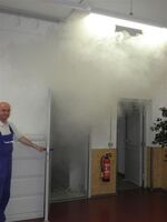 Mittels einer Nebelmaschine wurden im Technikraum des Lastaufzugs die Rauchmelder aktiviert. Natürlich war diese Übung keinesfalls  angekündigt, jedoch erschien die Reaktion der Kollegen doch recht gelassen, teils wie abgesprochen… Wer die Situation vorher genau beobachte konnte wahrscheinlich 1+1 zusammenzählen… Alle verließen kurzerhand ihren Arbeitsplatz und fanden sich vorbildlich auf dem Sammelplatz hinter dem Gutshaus ein. Ob jedermann jedoch auch so in einem „wahren“ Brandfall reagieren würde, bleibt offen. Jeder sollte sich hier noch einmal Gedanken machen.