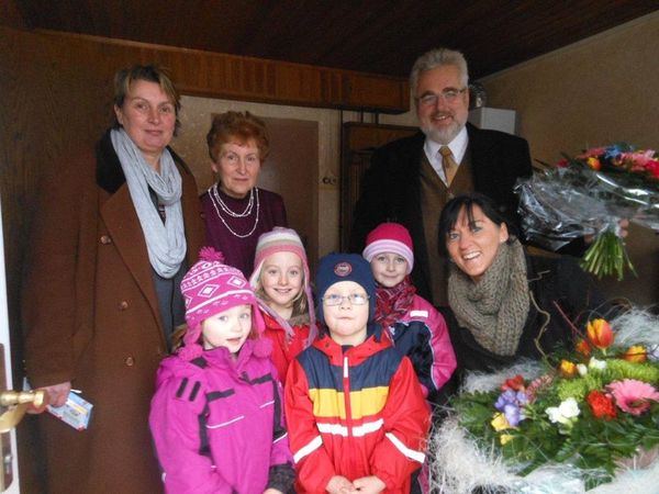 Das Foto zeigt Frau Schwadtke an ihrem Ehrentag anlässlich der Gratulation. V.l.n.r.: Frau Carola Gienke, Frau Renate Schwadtke, Herr Pastor Bernd Gienke und Frau Christiane Beck.