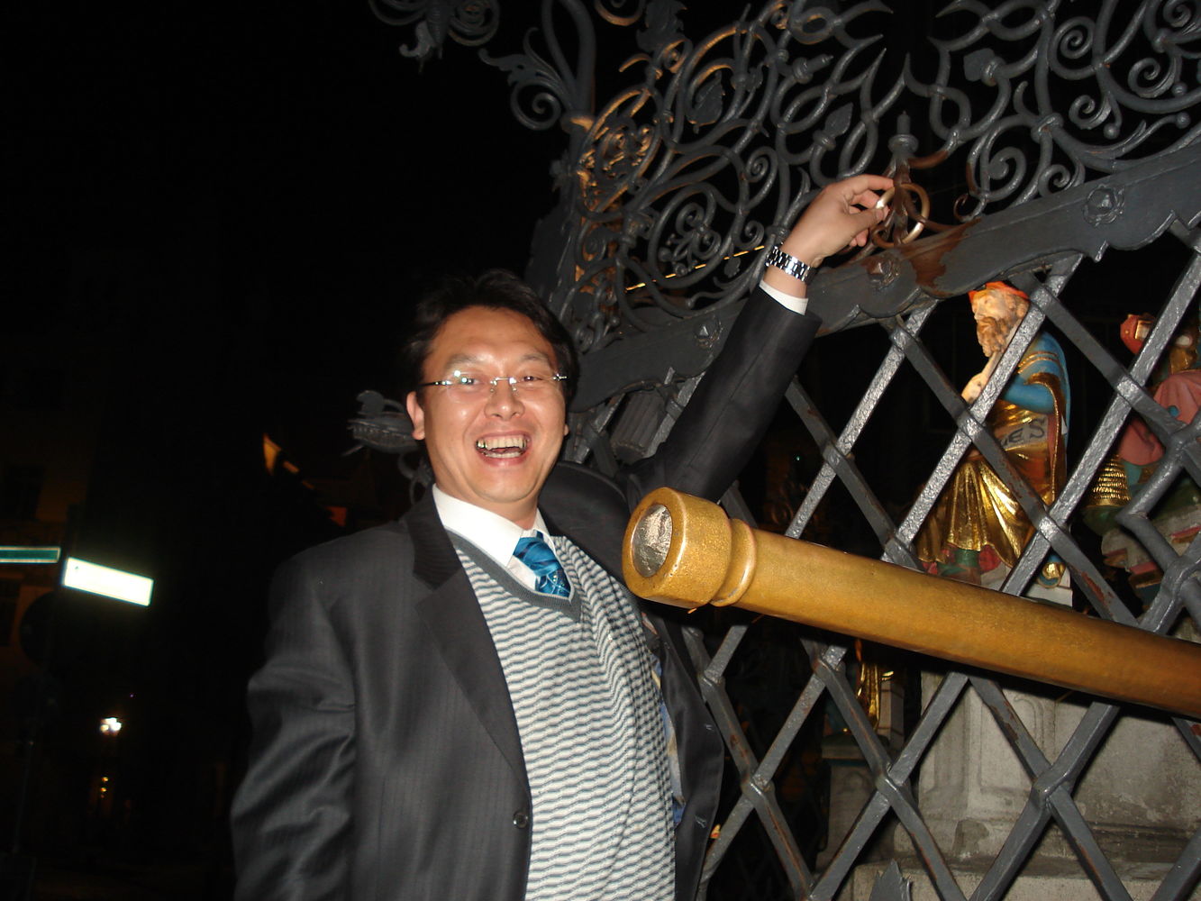 Peter Na dreht am goldenen Ring des "Schönen Brunnens". Wenn man sich etwas wünscht, geht es in Erfüllung. So lautet eine alte Nürnberger Sage.