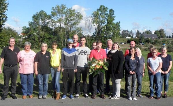 Tino Feldmann im Kreise der Kollegen und Kolleginnen der Produktion der NL Rustow gegenüber dem Betriebsgebäude.