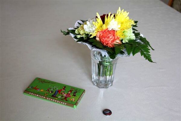 Um 10 Uhr morgens hat sich die gesamte Belegschaft vom Standort Rustow im „Eiersaal“des Gutshauses zu einem gemütlichen Sektumtrunk eingefunden. Für die Damen gabs einen kleinen Strauß Blumen und für die Herren eine Flasche „Rotkäppchen" – ein Markensekt, den es auch schon zu DDR-Zeiten gab. Alle gemeinsam bekamen noch eine Tafel Schokolade „Rotstern" , ebenfalls ein Produkt aus DDR-Zeiten, welches lecker schmeckt und noch am Markt erhältlich ist. Wer dann noch nicht genug hatte, der durfte sich die Plakette „HELD DER ARBEIT“ anheften.